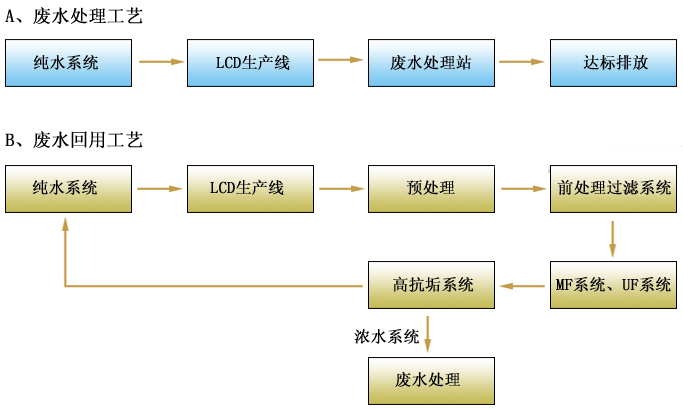 LCD制程清洗废水回用前与回用后系统工艺流程示意图如下: